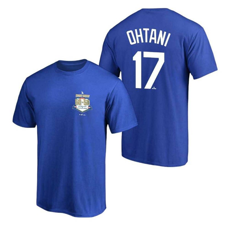 前人未到の偉業「50本塁打・50盗塁」を達成したロサンゼルス・ドジャースの大谷翔平を称えた記念Tシャツ。