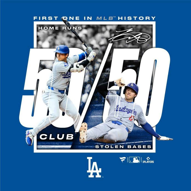 前人未到の偉業「50本塁打・50盗塁」を達成したロサンゼルス・ドジャースの大谷翔平を称えた記念Tシャツ。