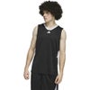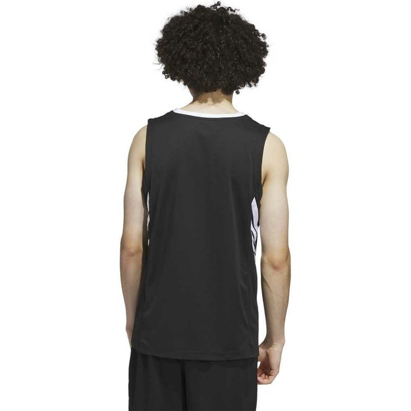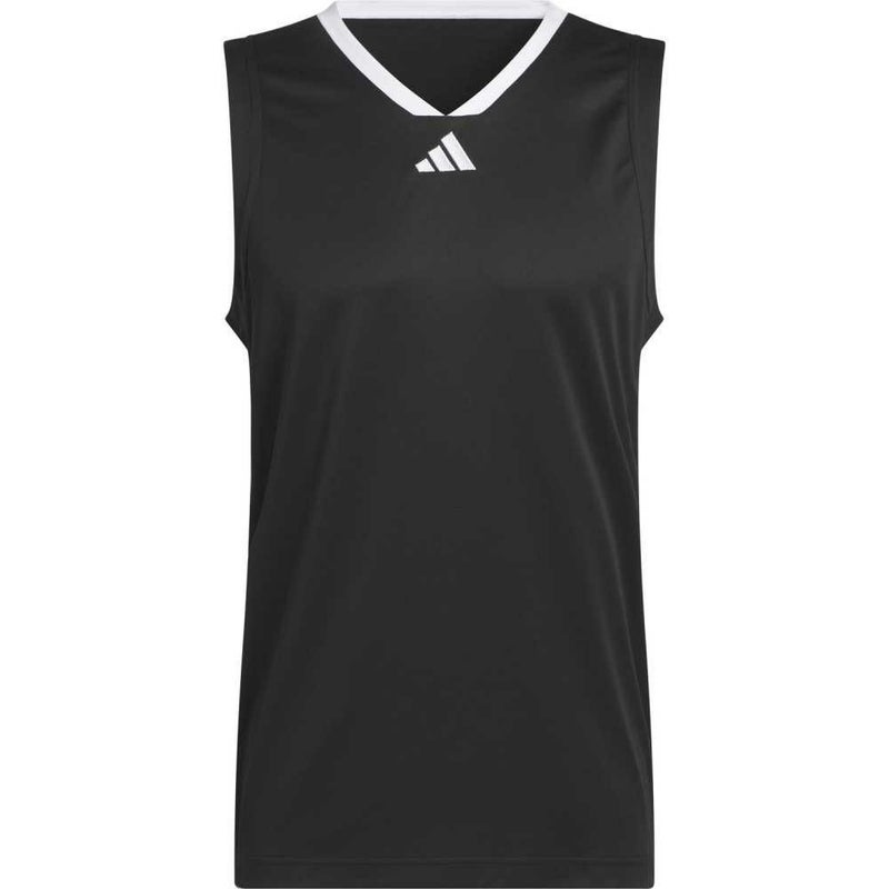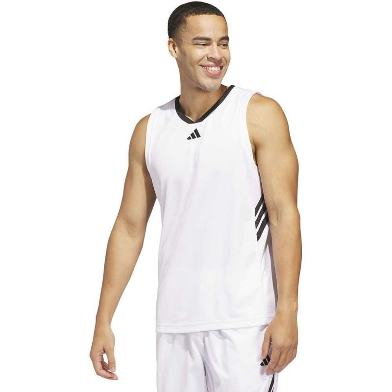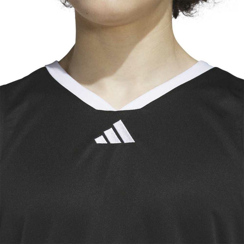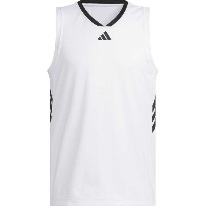 バスケットボールコートで躍動するための、快適でクラシックなデザイン。深いアームホールとVネックが特徴の、ジャンプシュートを打つときにも動きやすい、アディダス バスケットボールジャージー。
