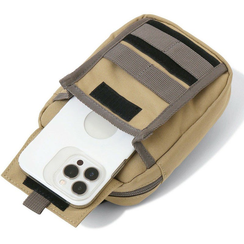 フロントポケット。メインルームにはスマートフォンや使用頻度の高い、小物を素早く取り出せる。(iPhone13~15など6.1インチ程度であれば収納可能)