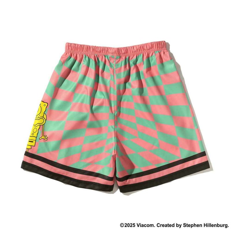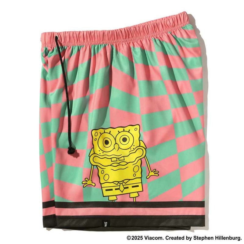 カラフルなチェッカーフラッグ柄がポップなスポンジ・ボブデザインの総柄布帛プリントショーツ。