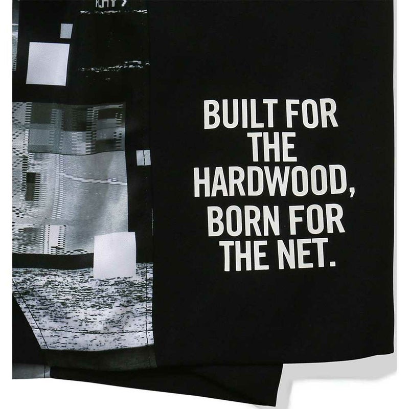 バスケットボールシーンのデジタルなグラフィックをコラージュしたパターンをサイドで切り替えたデザインの布帛パンツ。