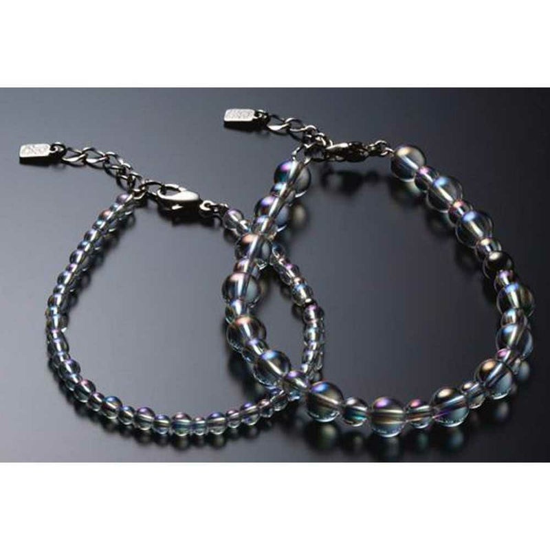 七色の煌きを纏ったクリスタルアクセサリー。独自の品質チェックで厳選した水晶の表面に、チタンをコーティング。七色の輝きを纏った2サイズの水晶を組み合わせ、表情豊かなブレスレットに仕上げました。留め具はアジャスター付きで、最大3cmの延長が可能。 素材:本体/水晶、チタンボール、留め具/チタン、アジャスター/チタン、プレート(エンドパーツ)/チタン サイズ:17cm(留め具長さ含む) 仕様:水晶/直径3mm・4mm、チタンボール/直径2.5mm、留め具/1.5cm ※ワイヤーが切れた場合などの修理の受け付けは、フリーダイヤル0120-524-976(9:00~18:00 土・日・祝日休み)にご連絡下さい。 ※使用状況によっては、チタンコーティングがはがれてしまう恐れがございますので、ご注意ください。特に超音波洗浄機などを使うとはがれる危険性が高くなります。洗浄の際は布に水分を含ませて、ふき取る程度にしてください。 原産国:日本
