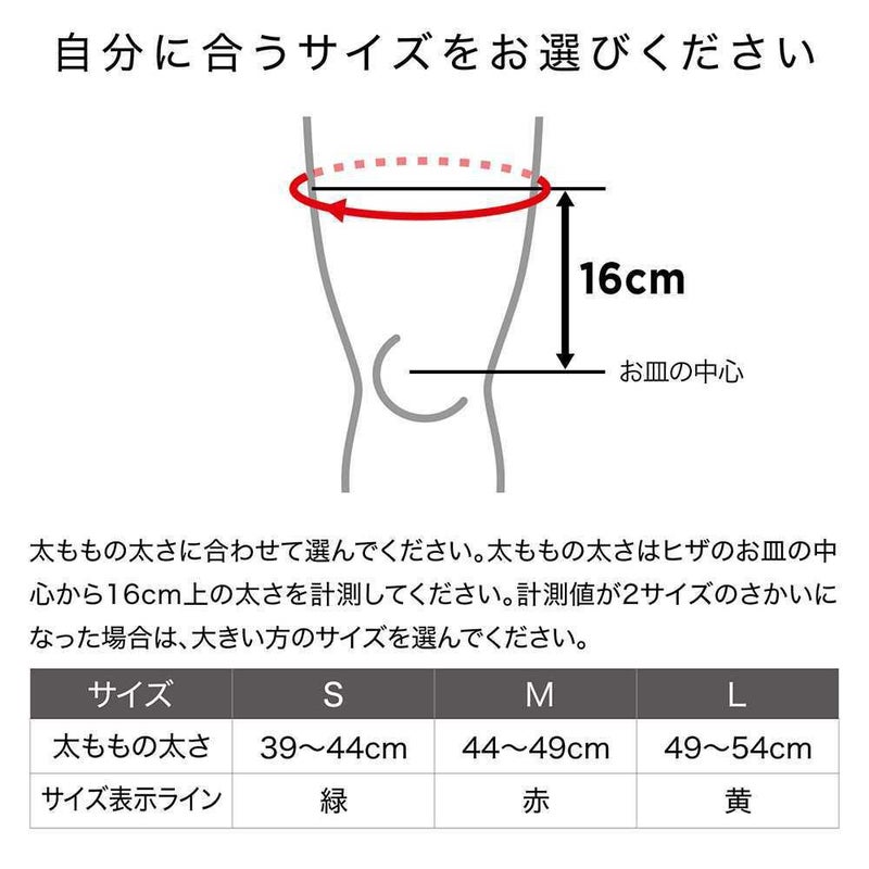 普通に立った状態でヒザのお皿の中心から16cm上の太ももの太さに合わせて(値がさかいになった場合は大きいサイズを)お選びください。