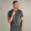 胸にメタルプレートのロゴデザインのTシャツ。