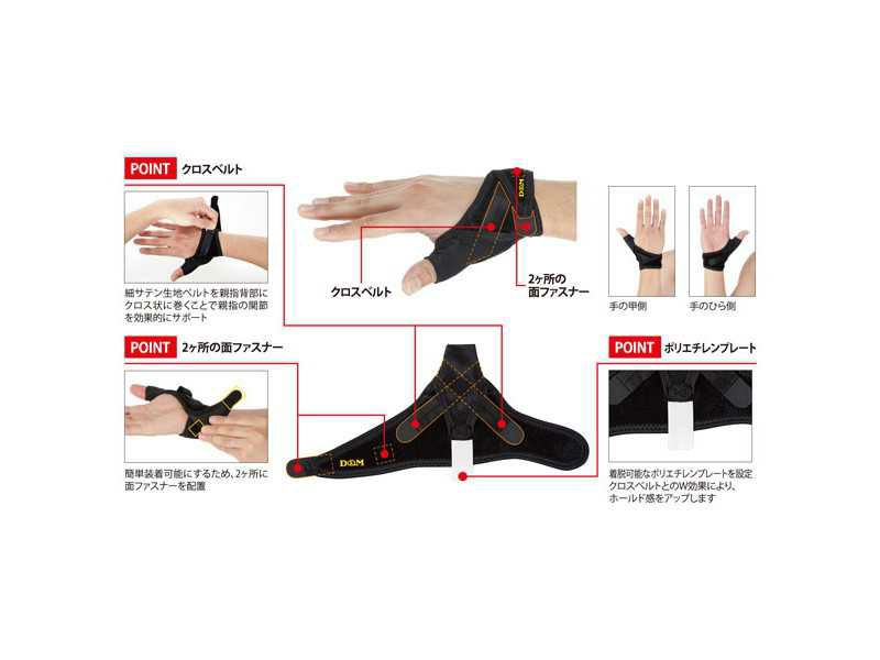 親指の反り返りを制限し、親指関節をサポートします。プレートとクロスベルトが安定させます。親指関節を的確にホールド・通気性とフィット感を併せ持ったウレタン素材を採用、好みのサポート力に調節可能です。2ヶ所に面ファスナー配置、簡単装着。
