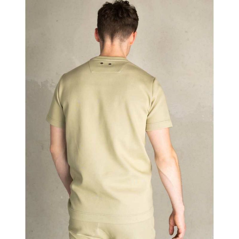 胸にメタルプレートのロゴデザインのTシャツ。