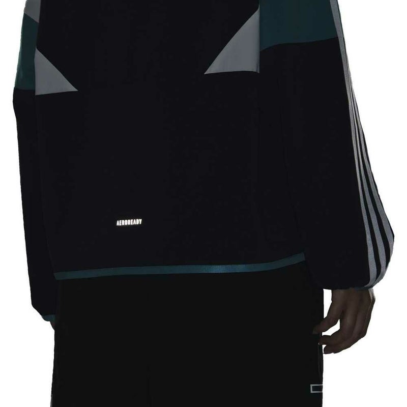 リサイクルポリエステル100%、AEROREADY、UPF50+機能を備えており、快適な着心地を提供する。左フロントにSPORTSWEARロゴ、左右袖にスリーストライプス。