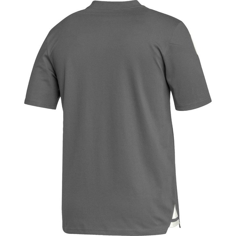 リブ仕上げのヘンリーネックで、クラシックかつスポーティーなスタイルのアディダスサッカーポロシャツ。