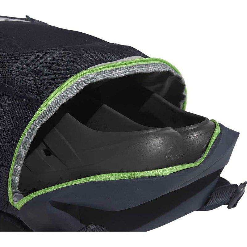 背面にエアメッシュパネル、長さ調節可能なショルダーストラップとチェストストラップ、上部にジップポケット、両サイドにメッシュポケット、外側にシューズ用コンパートメント、内側にオーガナイザー