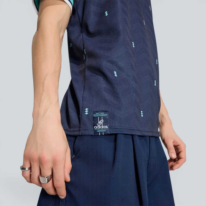 ドイツサッカー連盟のエンブレムとフラッグラベルのサインをあしらい、さらに、アイコニックなアディダスのロゴを備えてデザインをまとめている。