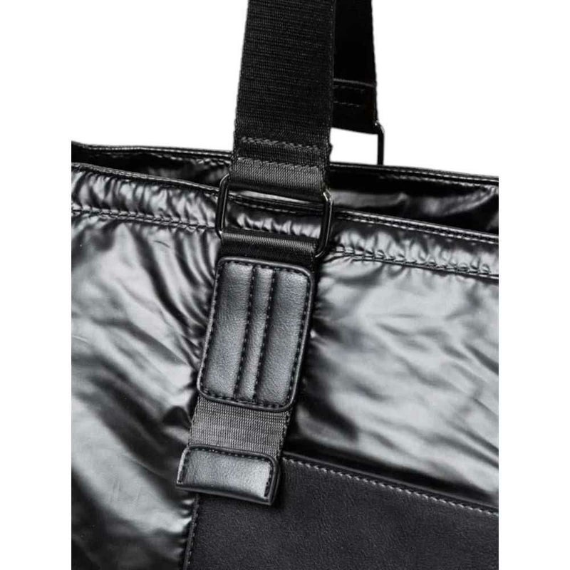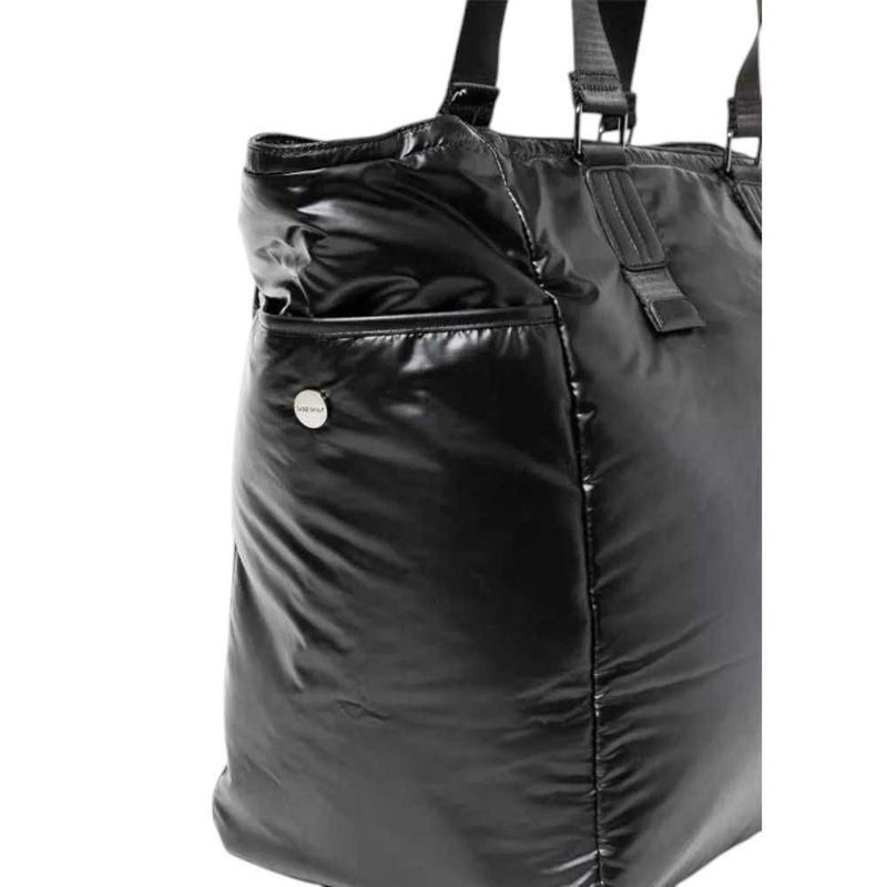 光沢感のある撥水素材にレザーパッチをあしらったトート型バッグ。