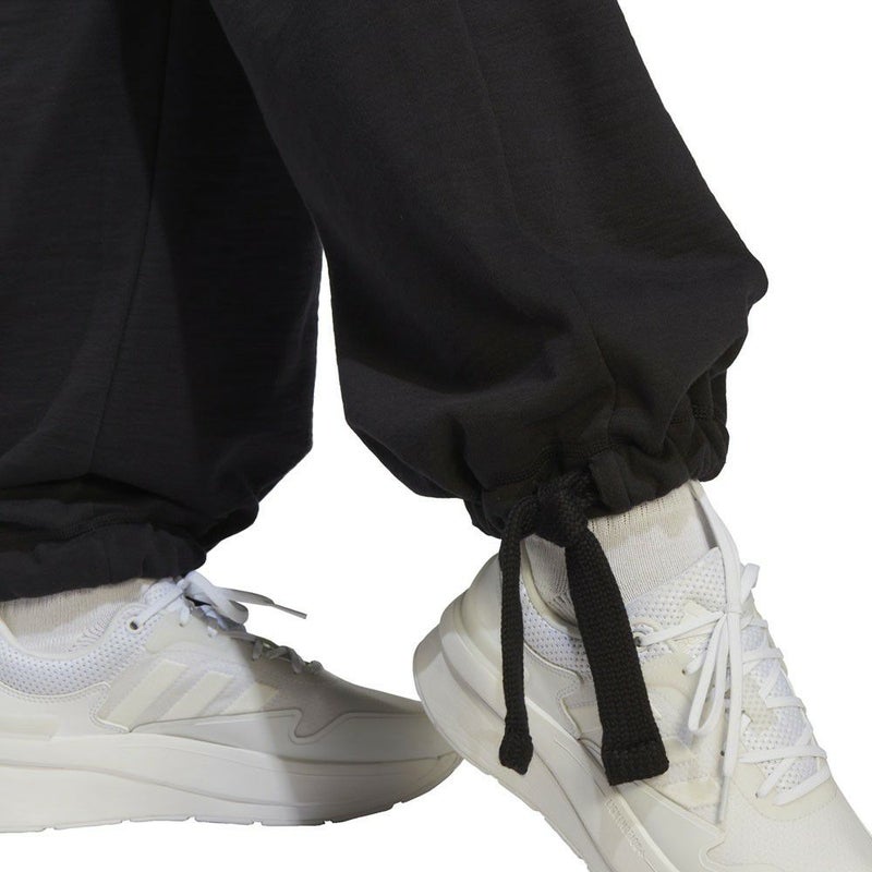 裾の太い引きひもを絞るとカフ仕上げのバルーンパンツのようになり、絞らないと流れるようなワイドレッグに。