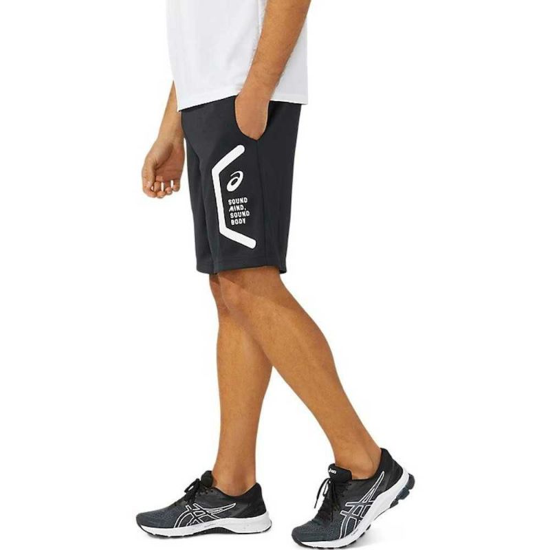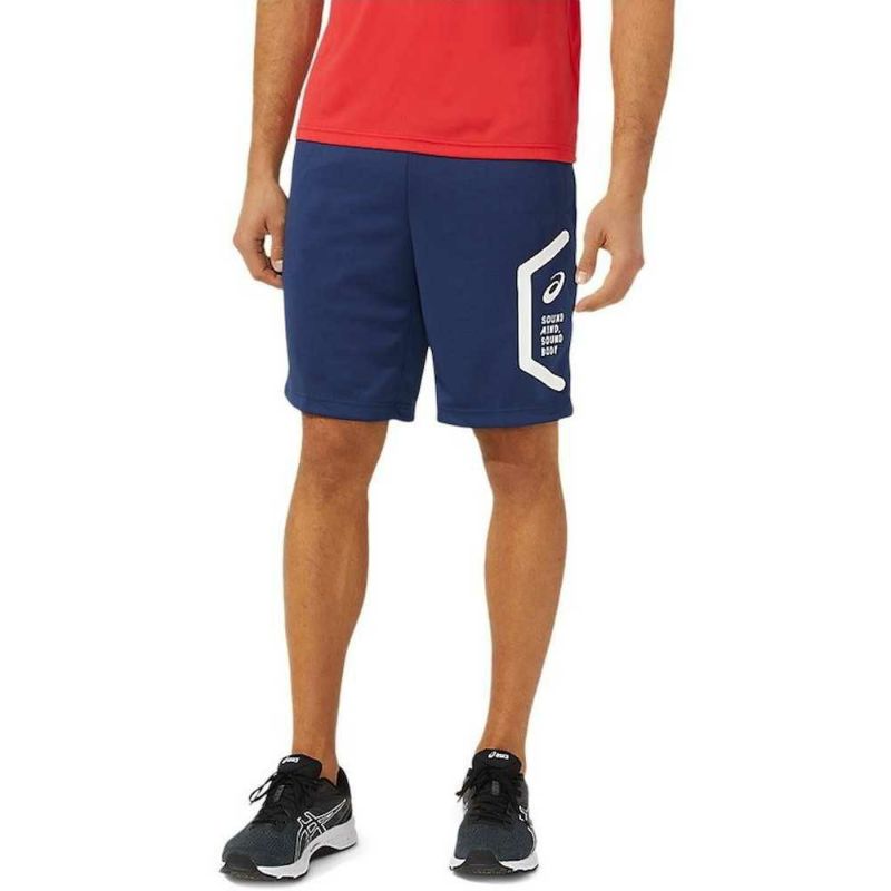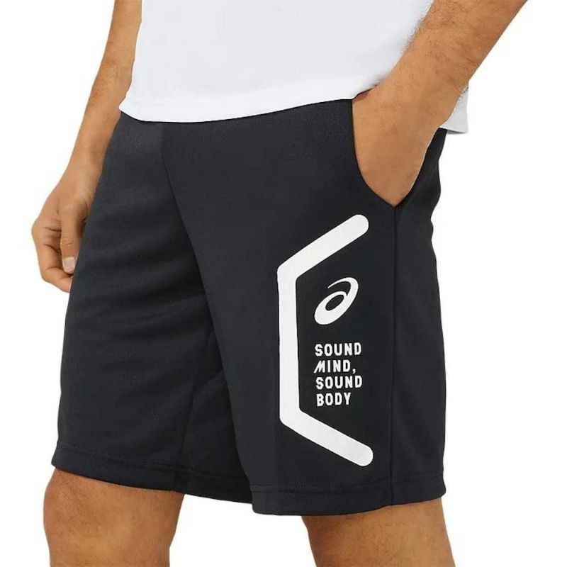 HEXAGONグラフィックにはアシックス企業スローガンでもある「SOUND MIND,\n SOUND BODY」を表記。優れた吸汗速乾性を追求した長期継続のトレーニングハーフパンツ。