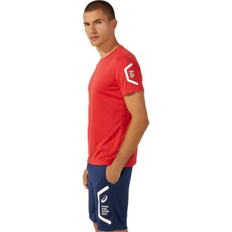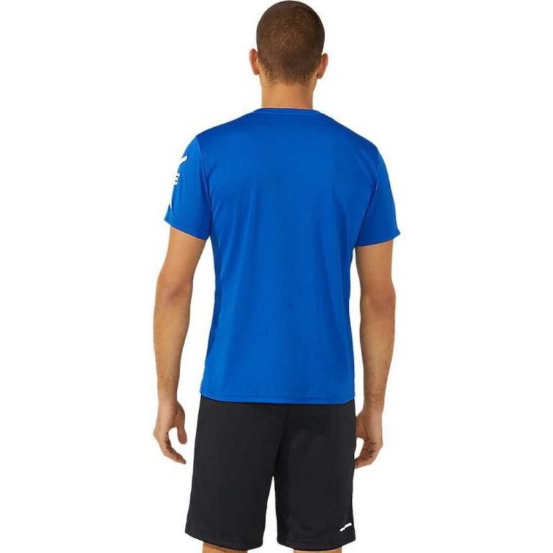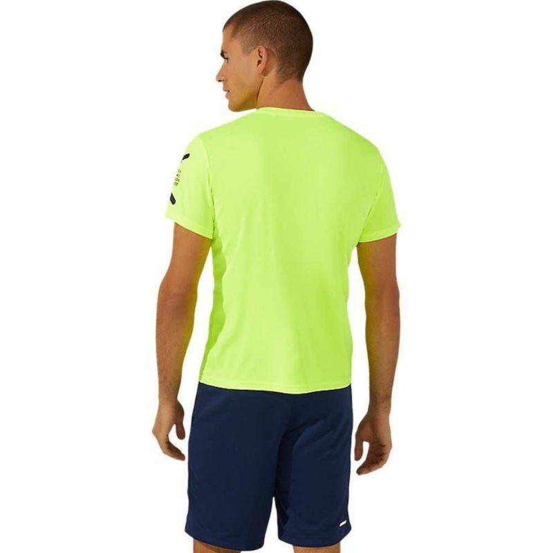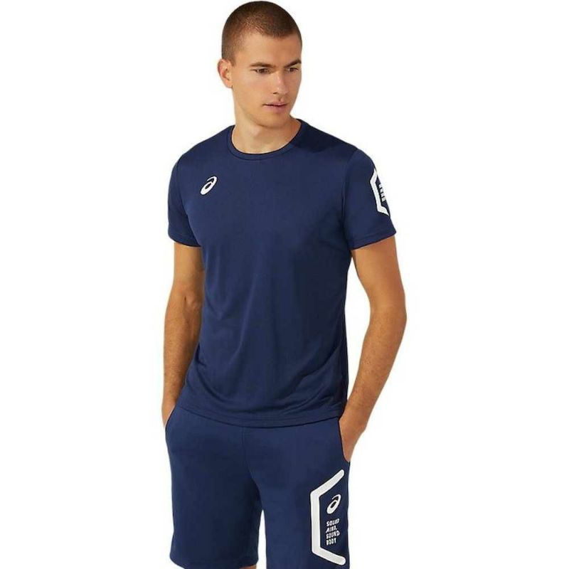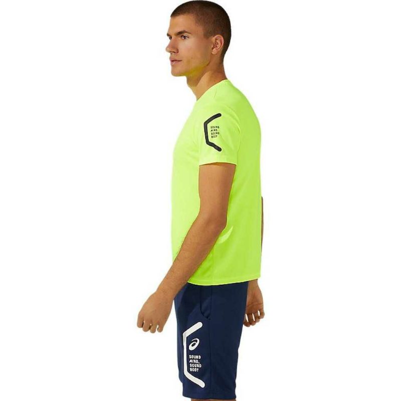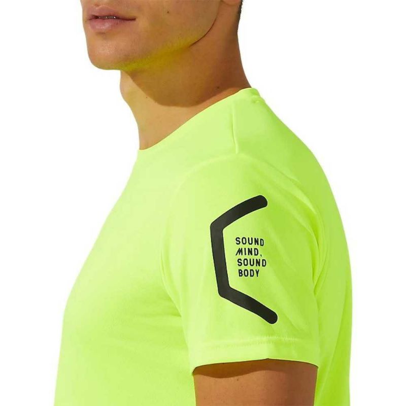 HEXAGONグラフィックにはアシックス企業スローガンでもある「SOUND MIND, SOUND BODY」を表記。優れた吸汗速乾性を追求した長期継続のショートスリーブトップ。