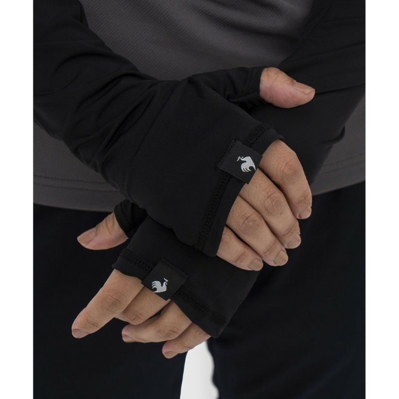 着用しているウェアの袖に隠れ、手の甲まで覆える長め丈感。好みで選べる、2種類のロゴカラー展開。
