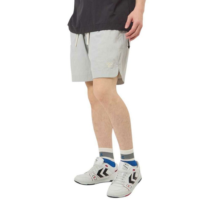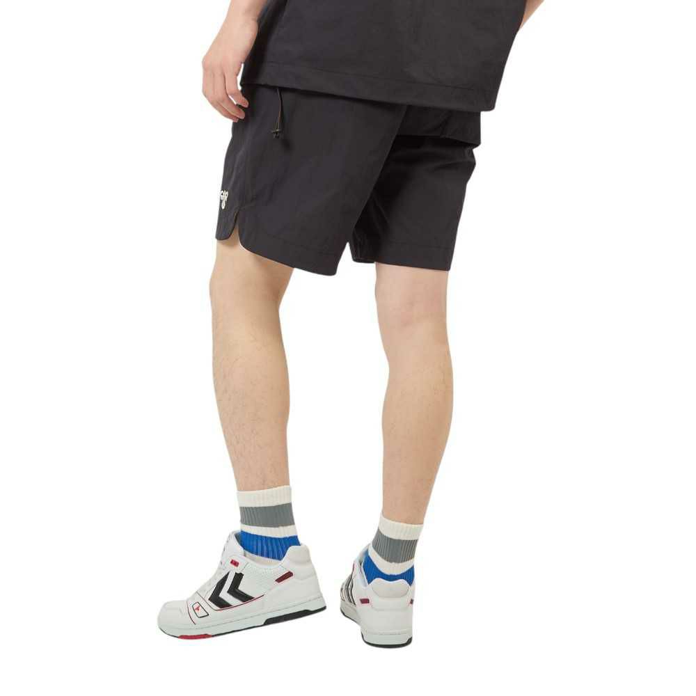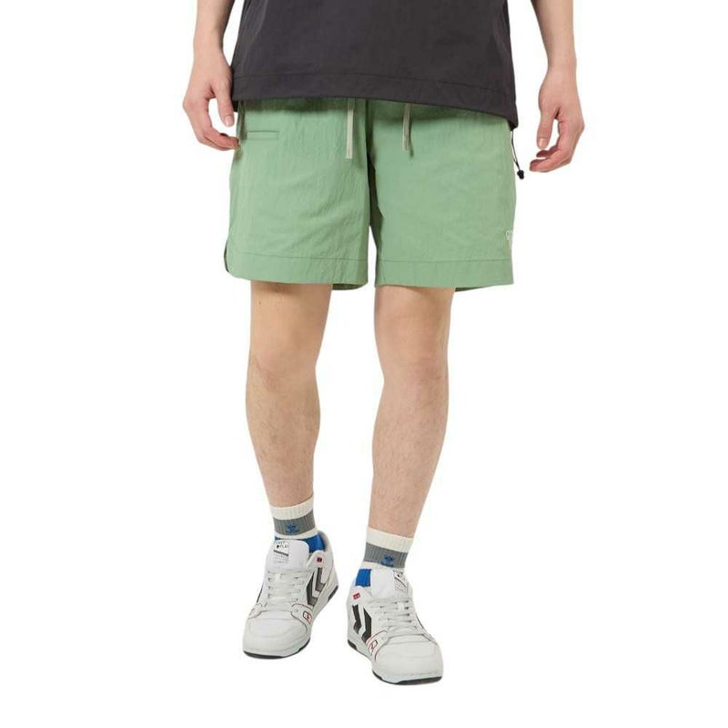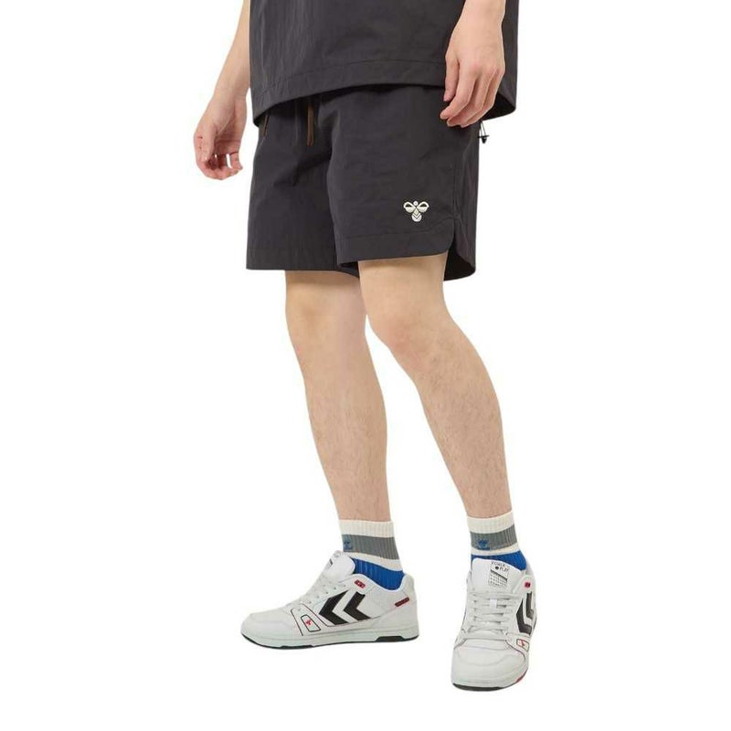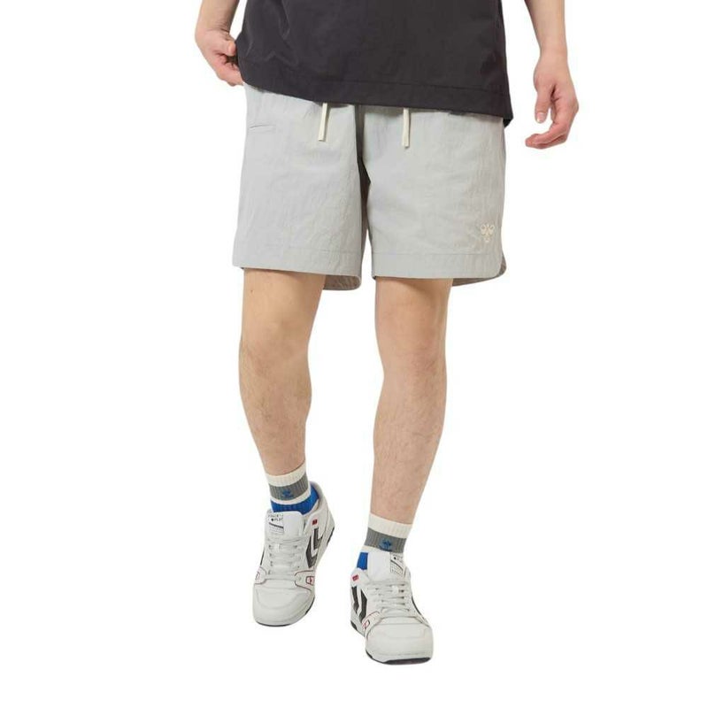 ナイロンタッサー素材を使用したウーブンショーツ。表撥水でドライなタッチ。両サイド、後身頃ポケット付き。バックポケットにはヒュンメルのブランドミッション『change the world through sport.』をデザイン。シンプルで使いやすいアイテムです。
