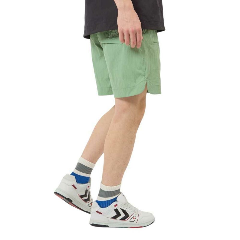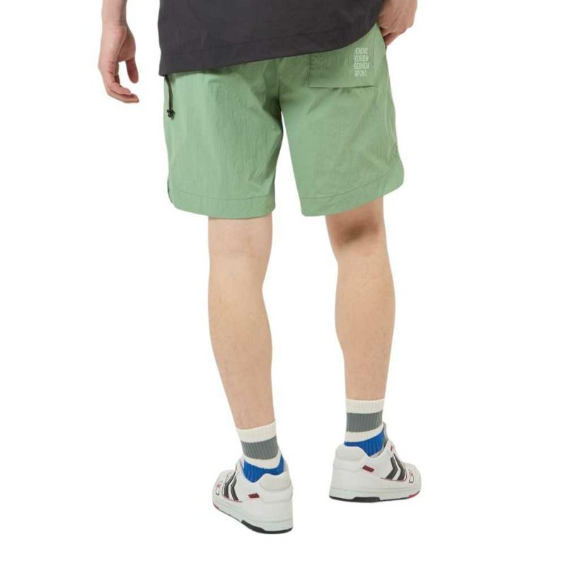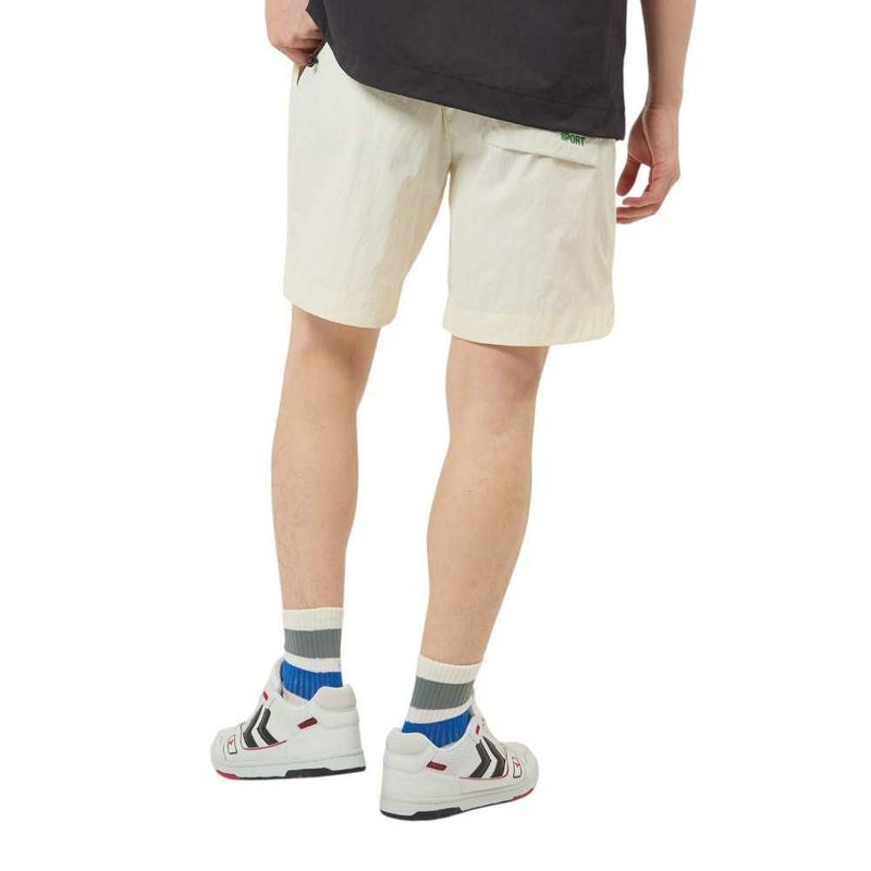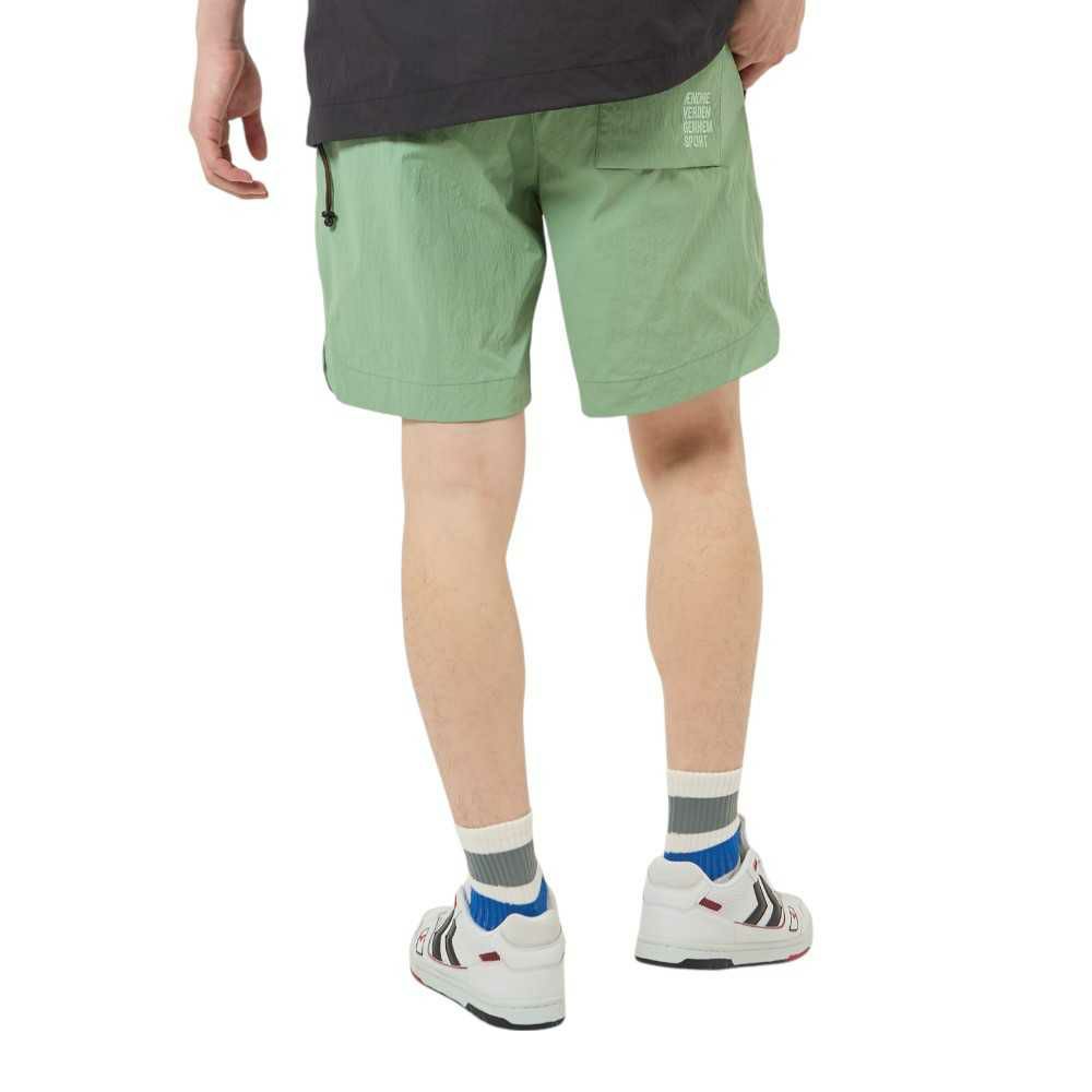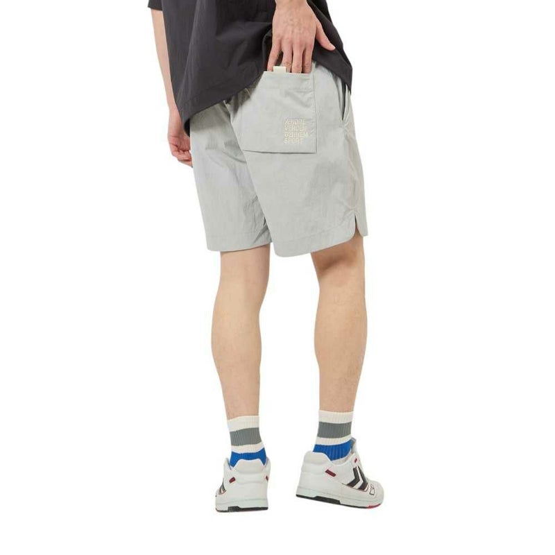 ナイロンタッサー素材を使用したウーブンショーツ。表撥水でドライなタッチ。両サイド、後身頃ポケット付き。バックポケットにはヒュンメルのブランドミッション『change the world through sport.』をデザイン。シンプルで使いやすいアイテムです。