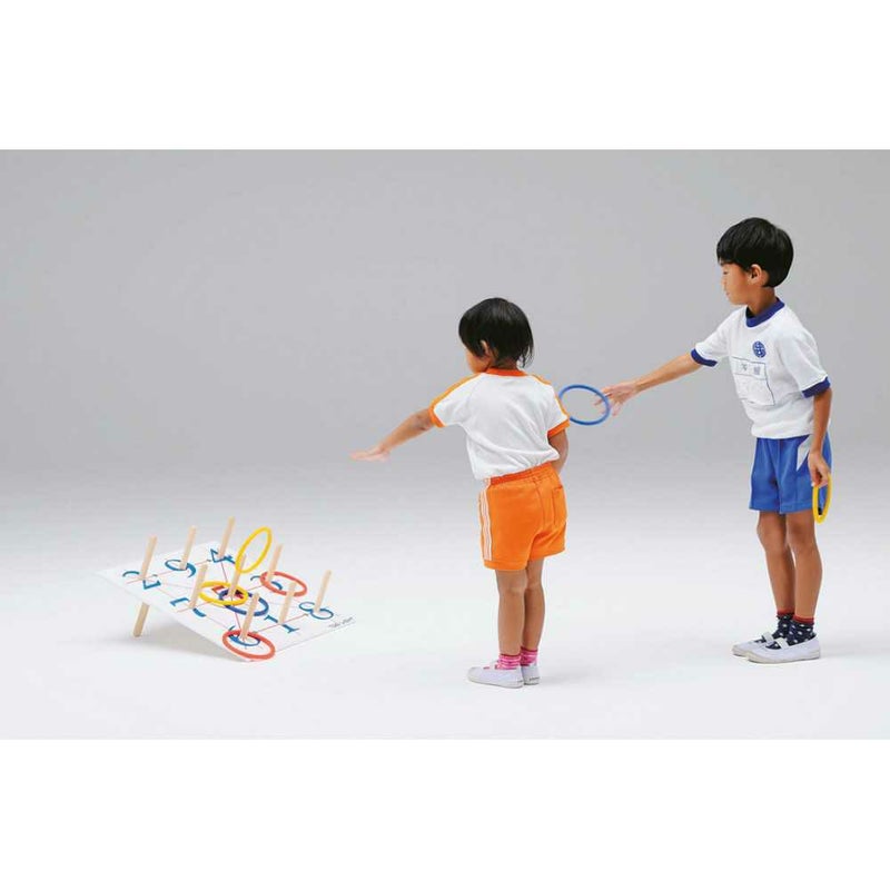 60cmのスタンダードボードと軽くて投げやすい樹脂製リングのセットで各種イベントに最適です。ボード裏の脚部の取付法で高さ・角度が設定できます。