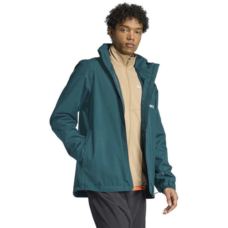 このアディダスレインジャケットは、雨が降り始めてもアクティブに過ごせるように防水性と透湿性を兼ね備えている。
