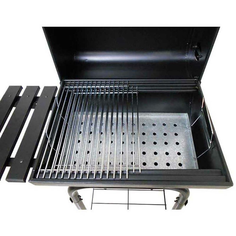 素材:本体・ふた・フレーム・サイドテーブル・棚網・煙突:鉄(エポキシ樹脂塗装)、バーベキュー網・ハンドル(目皿用):鉄(クロムめっき)、目皿:亜鉛めっき鋼板、バー:ステンレス鋼、車輪:ポリプロピレン
