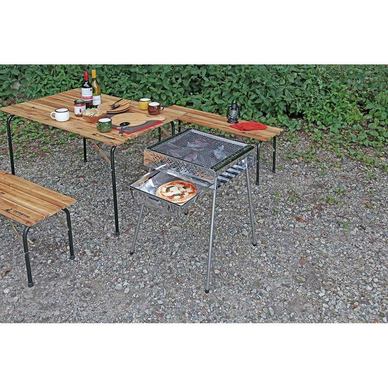 1台7役のステンレス製多機能グリル。焚火やBBQの熱でピザが焼けます。スライド式のトレーに24cmまでのピザが入ります。トップオーブンシステムによる上からの加熱で、生地が焦げずにふっくら焼き上がります。ハイ72cm・ロー34cmの高さ2段階調節が可能。本体はダッチオーブン25cmがすっぽり入る大きさ。焼き面の両サイドにある大小2種類の穴で串焼きも可能。串を差し込む穴を変えることで焼き加減を調節できます。