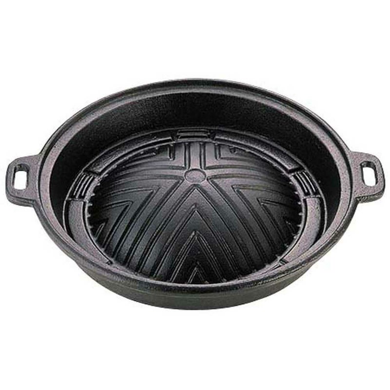 中心から延びている溝により、肉から出る脂や水分を落し、おいしく焼き上げます。保温性が良いため油に温度差ができにくく、熱が均一に伝わるのでムラなく焼き上がります。鉄器の表面は細かい凹凸におおわれています。ここに油がしみこみ、さらに加熱された空気が入り込むことで焦げつきを防ぐ働きをします。鉄器は使い込むほどに、油のなじみが良くなっていきます。鉄製品はため込んだ熱を簡単には逃さない性質を持っているので、アルミなどに比べてずっと保温性が良いです。