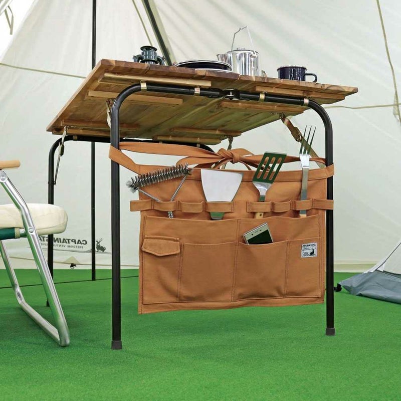 BBQだけではなく、テント経営などのフィールドワークやDIYにも適した多機能エプロン。テーブルの金具等にも取り付け可能です。