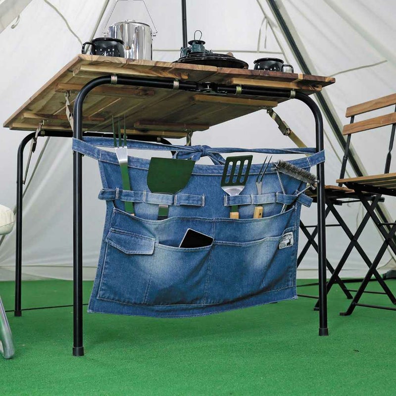バーベキューや、テント設営などのフィールドワークやDIYにも適した多機能エプロンです。丈夫なデニム生地を使用。ワンウォッシュ加工で、しなやかな使い心地です。テーブルの金具等に取り付けて小物入れとしても使用できます。
