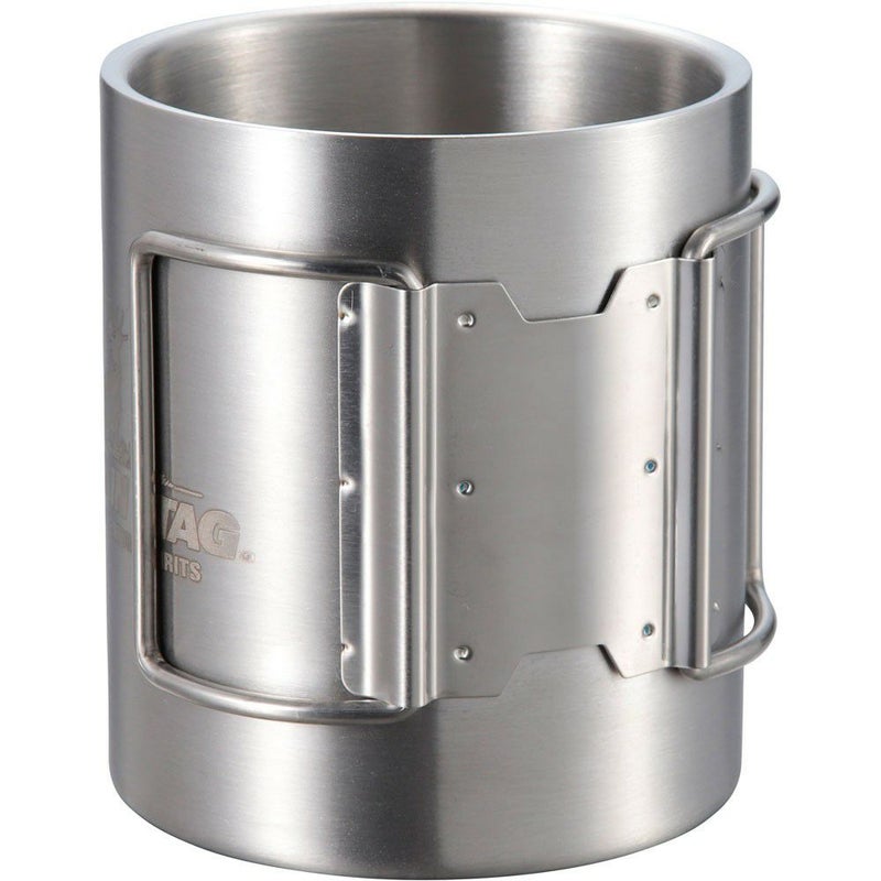 中空二重構造で冷めにくいステンレス製マグカップ。ハンドルは折りたたみ可能。