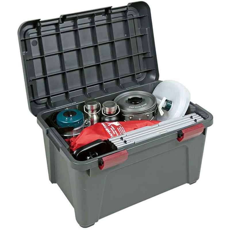 キャンプ用品や車載工具などの収納に便利な、丈夫なボディで大容量のコンテナです。イスにも使える頑丈なフタ。