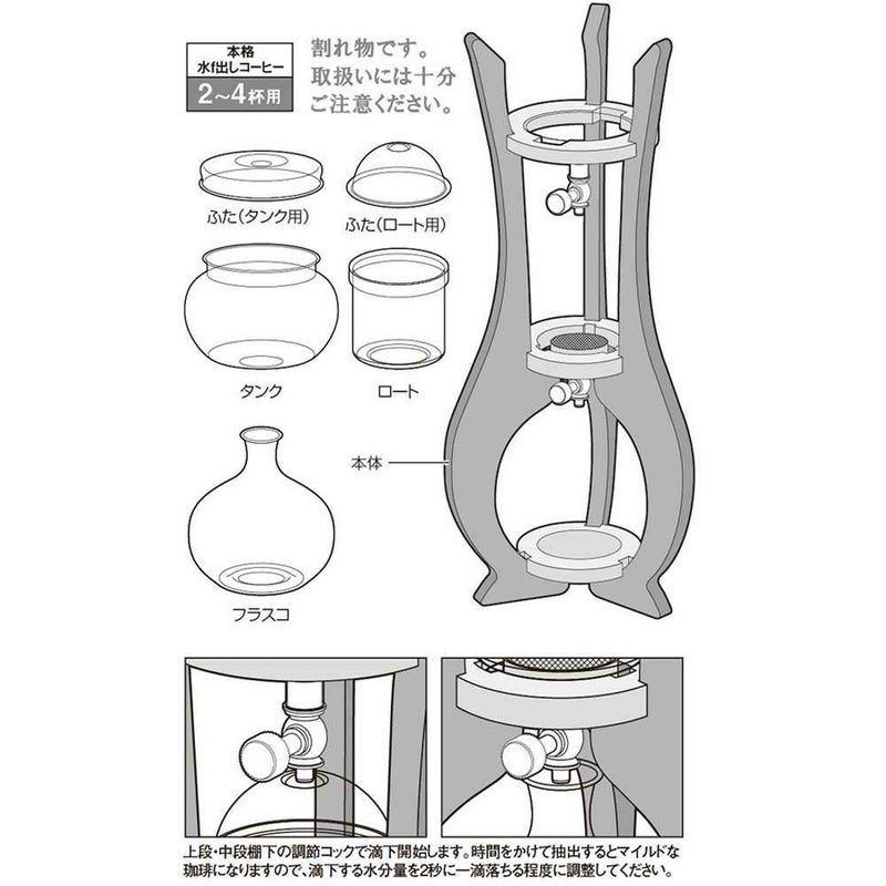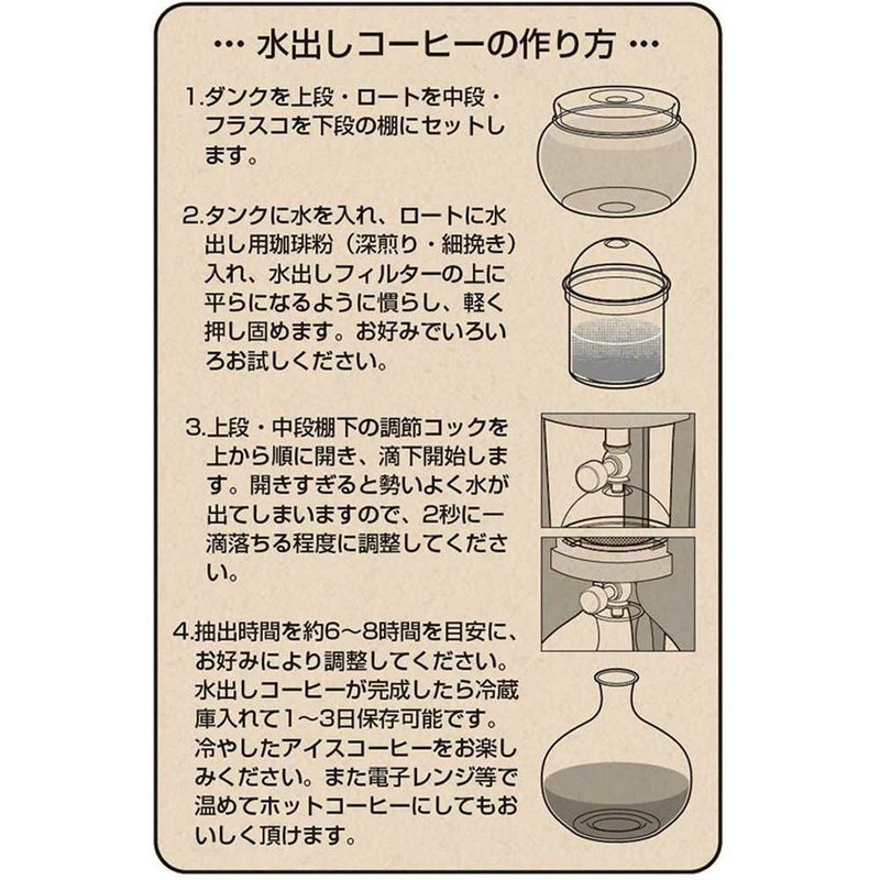 素材:タンク・タンクふた・ロート・ロートふた・フラスコ/耐熱ガラス、調節コック/真鍮、パッキン/シリコン樹脂、水出しフィル ター/ステンレス、棚・スタンド/天然木