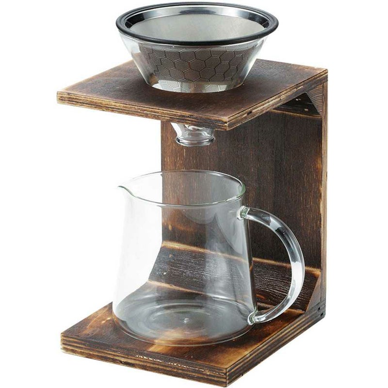 使いやすいシンプルなデザイン。ペーパーフィルター不要の珈琲ドリッパーセット。フィルターとドリップ部をセットするだけで手軽に本格的な珈琲を楽しむことができます。ペーパーフィルターが不要な2層メッシュ加工。エコにも繋がります。2~4杯用。天然木の風合いがインテリアとして雰囲気のある木製スタンド。