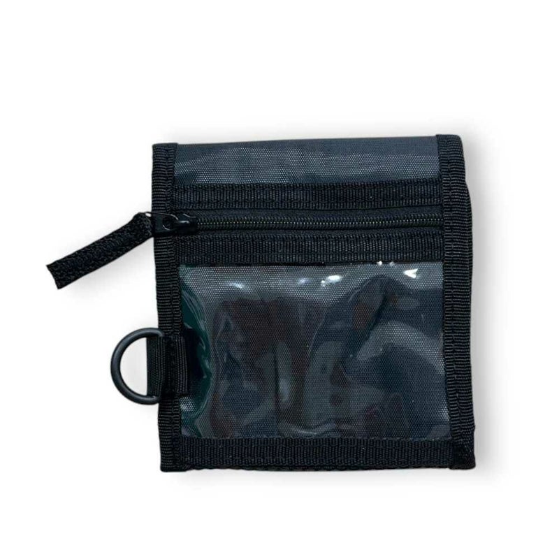内部にファスナータイプの小銭入れ、裏側には透明なファスナーポケット付き。