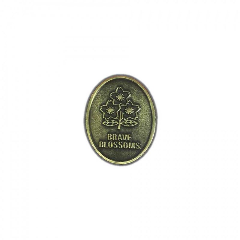 桜をかたどったメタルピンバッジ。エンブレムが描かれています。