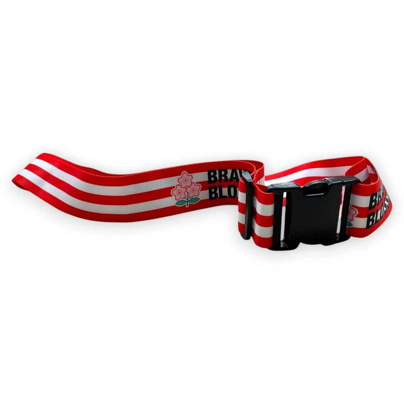 ラグビー日本代表のロゴと「ブレイブ・ブロッサムズ」の愛称がプリントされたキャリーケースベルトです。バンドの幅は5cmで、長さは90cmから180cmまで調節可能です。