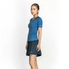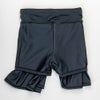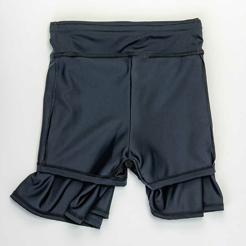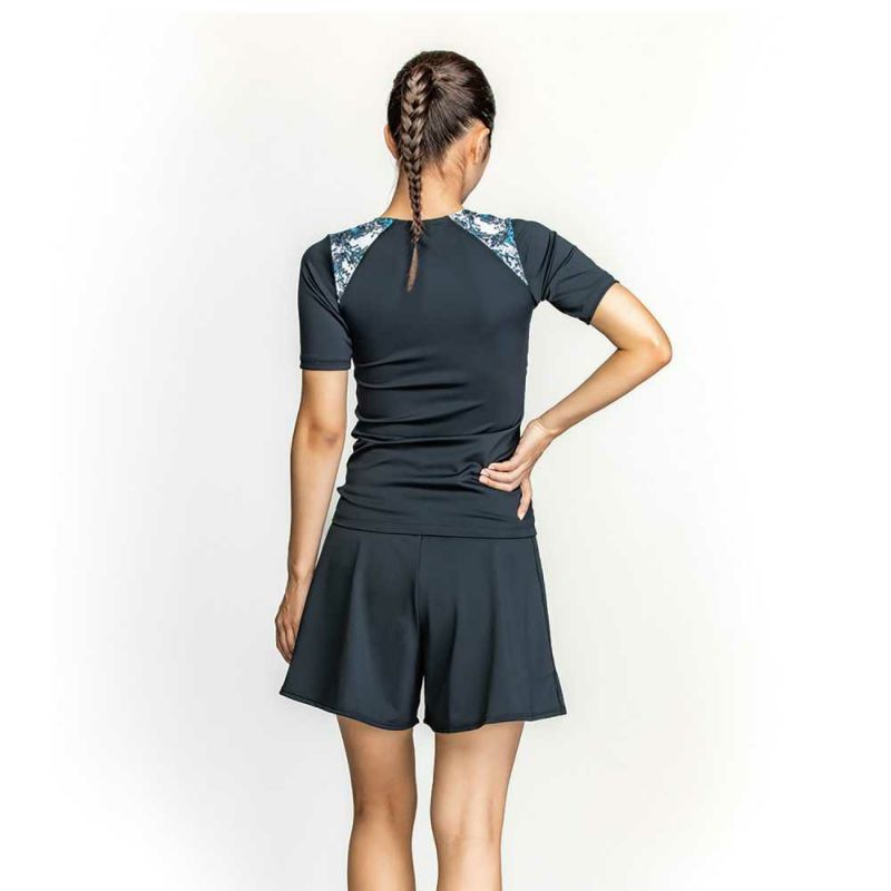長めの丈のふんわりしたフレアシルエットで気になるお尻や太ももをすっきりカバーする、「2in1」パンツのフィットネス水着。