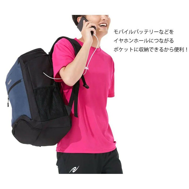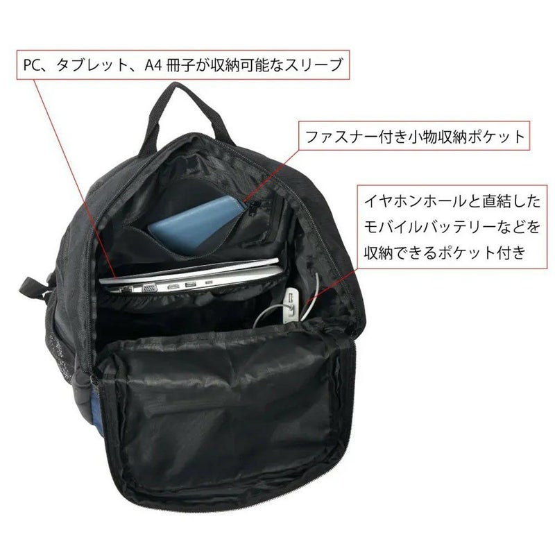 仕様:フロント部ファスナー付きポケット、メイン部ダブルファスナー仕様、両サイドメッシュポケット、PC用スリーブ、ファスナー引手付きシューズ収納ポケット、スライド式チェストストラップ、イヤホーンホール付き、本体上部持ち手、背面部・ショルダー部メッシュ生地採用