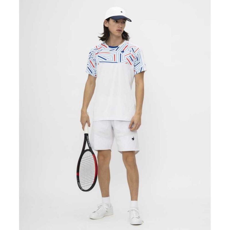テニスの基本動作である、サーブ・ストローク・ボレーの動きに着目し、DISCで検証し開発したウェア。動作時のストレスをダーツとパターンで解消した”AILE FORME(エールフォルム)”パターンを搭載したゲームシャツです。袖を腕を上げた状態のパターンにすることでサーブ時の腕の可動域を確保し、肩回りにダーツを施すことで適度にゆとりを持たせ、ストローク・ボレー時の肩回りの可動域を確保しております。フランスの伝統的なストライプ柄を様々な形で配置したスポーティーなグラフィックがデザインポイントです。細部までこだわり作られた商品の着心地を体感してみてください。